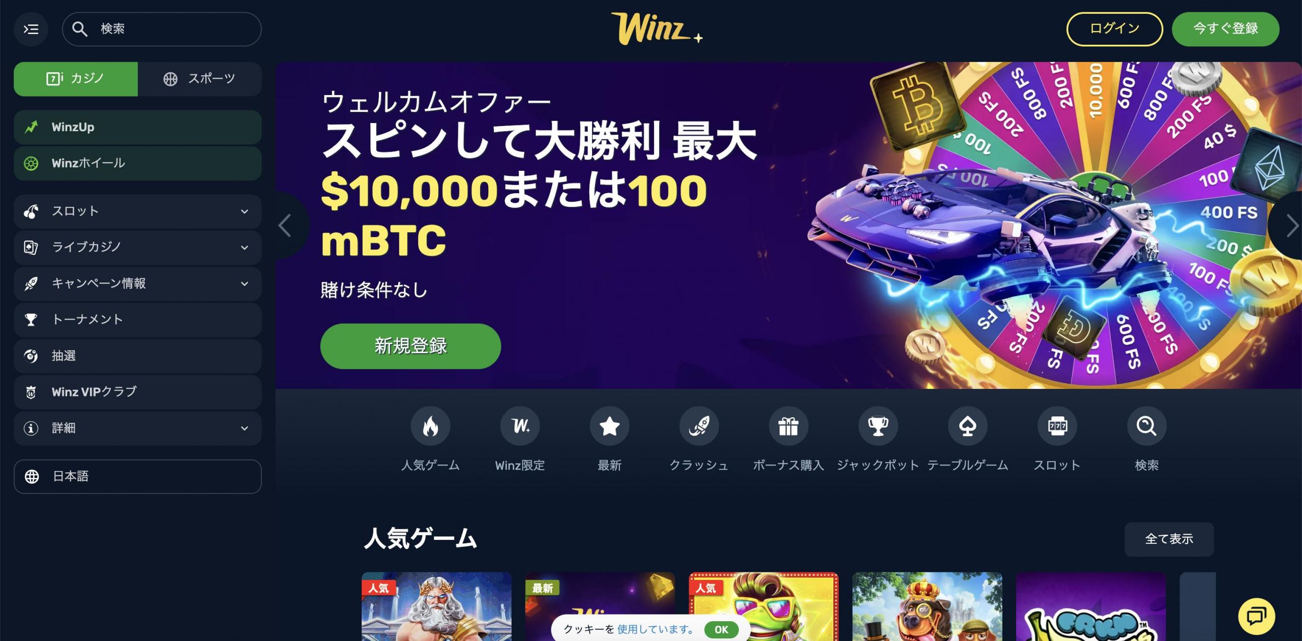スロット以外にもライブカジノやテーブルゲーム、Winz限定のゲームなど豊富なゲームが用意されており、プレイヤーを飽きさせない設計になっています。